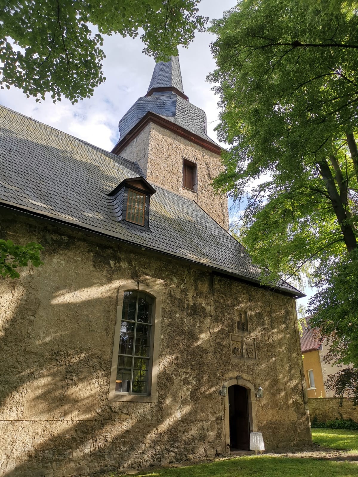 Das Kirchenschiff und der Turm sind heute mit Schiefer gedeckt. Das Dach des Kirchenschiffs besitzt rechts und links jeweils drei Gauben. Das Schiff hat zudem Rundbogenfenster in den Wänden. Der spitze etagenmäßige Turm besitzt eine Turmknopf.