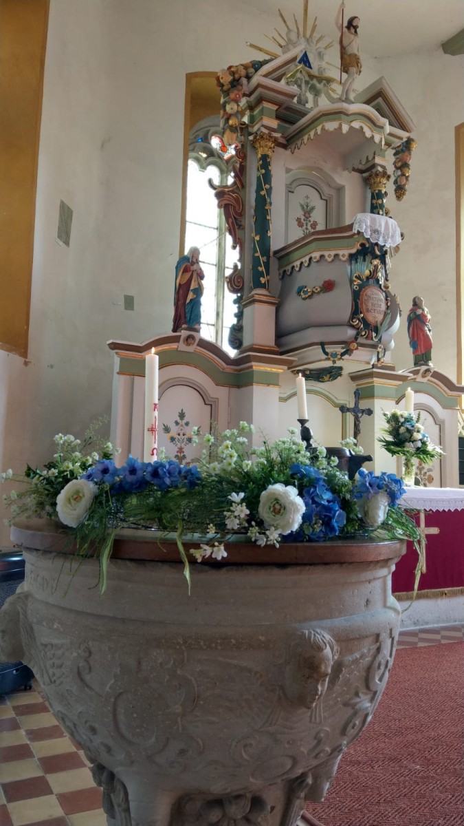 Der Taufstein ist mit Engelsköpfen und Ornamenten verziert. Ein Wappenschild von Teuner ist angebracht.