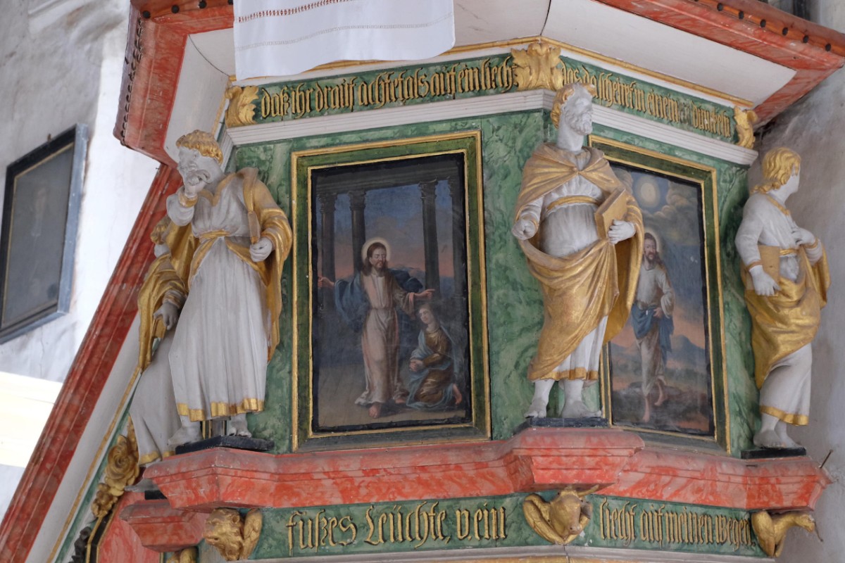 Das im 18. Jahrhundert letztmalig umgebaute Gotteshaus hat einen bemerkenswerten Altar (1706, Christoph Meil). Innenraum wurde 1701 einheitlich gestaltet: Tonnengewölbe mit großzügiger Bemalung, umlaufende zweigeschossige Emporen, Brüstungsfelder mit biblischen Sprüchen und Szenen aus Christi Leben.