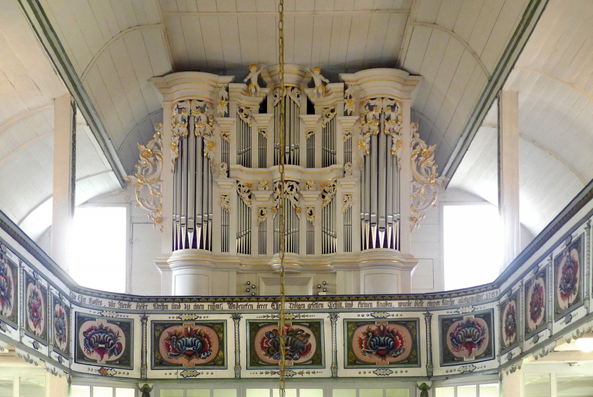 Das Langhaus wird von einem voll abgewalmten Mansarddach überdeckt. Die Brüstungsfelder sind mit Rankenornamentik ausgemalt. Am Logeneinbau unter der Südempore wird das Rankenmotiv in Form eines geschnitzten Gitters wieder aufgenommen. Der Kanzelaltar im Osten ist architektonisch aufgebaut, der Taufstein stammt aus der zweiten Hälfte des 15. Jahrhunderts.