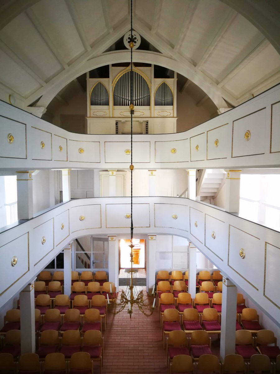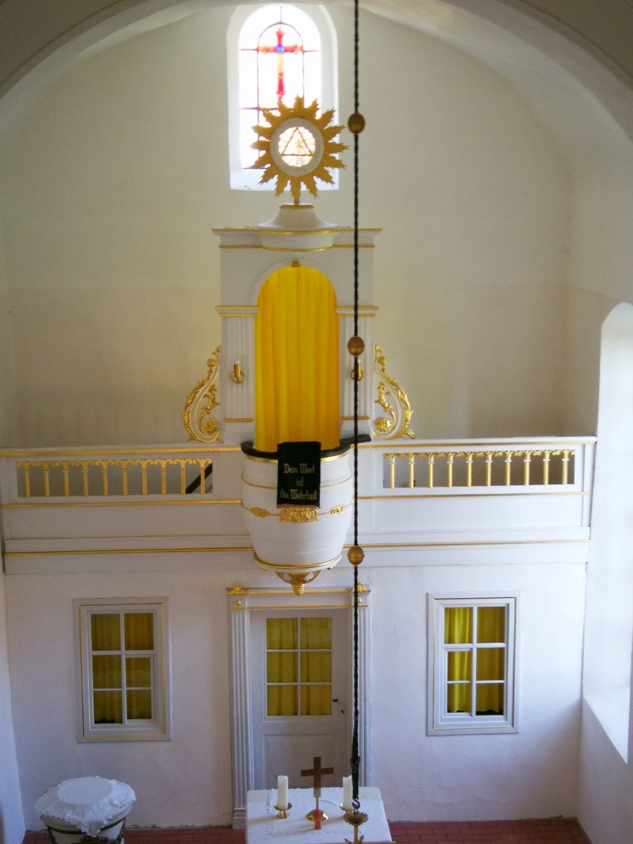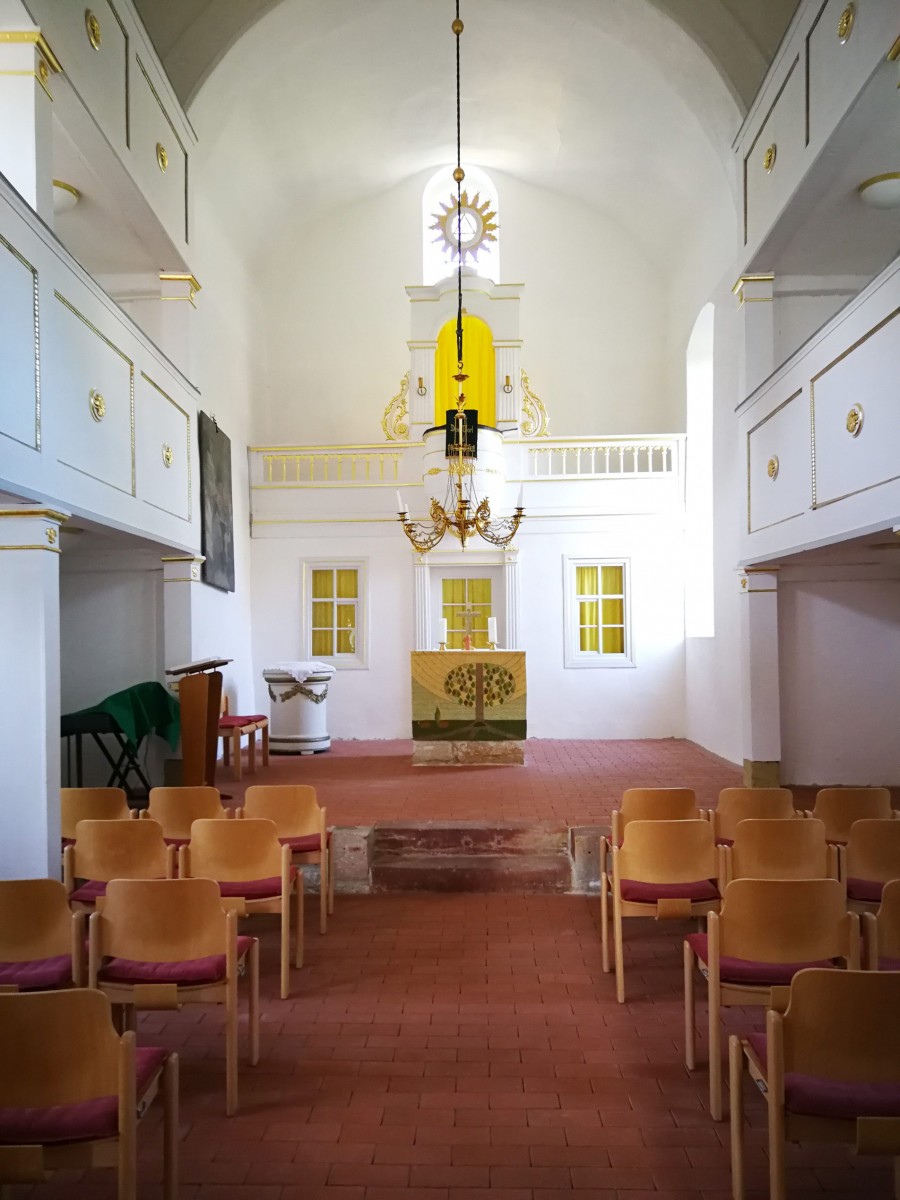 Schlicht, aber nicht schmucklos wirkt das Gotteshaus zwischen Friedhof und Kirchgarten. Im Inneren fällt der Blick auf die weißen Holzemporen mit zarten Goldverzierungen und die einfache Kanzel. Das Chorfenster im Osten hat eine bunte Verglasung.