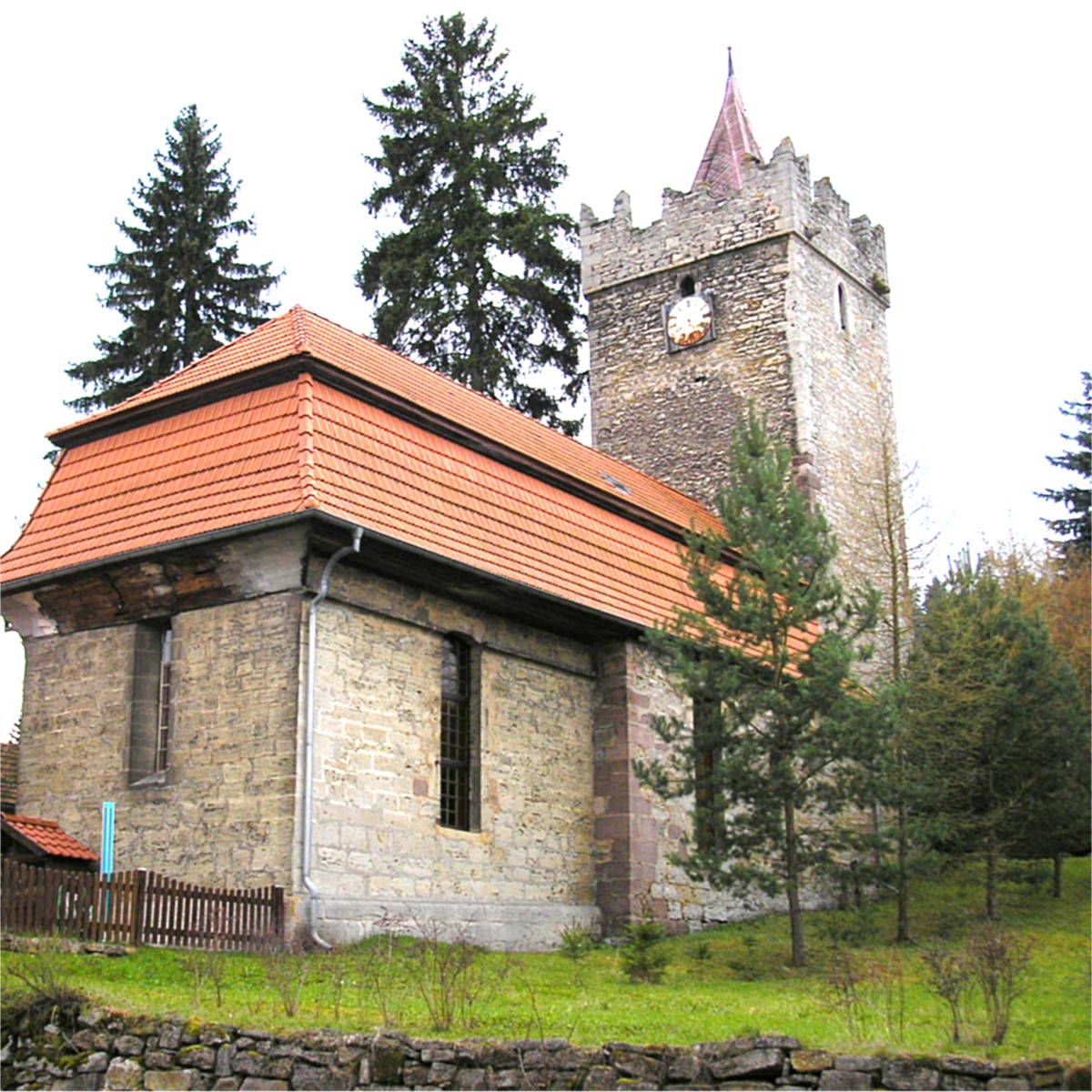 Saalkirche mit Ursprüngen im 12. Jahrhundert; Um- und Ausbauten 1696 und 1779. Westturm mit Spitzhelm und Zinnenkranz. Langhaus mit Holztonnen-Decke; Kanzelwand mit Flügelaltar (nach 1500): Petrus und Paulus, Hl. Familie auf Rückseite. Vesperbild (nach 1400).