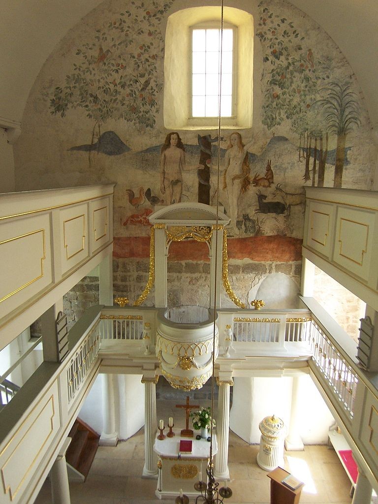 Bei Sanierungsarbeiten an der östlichen Giebelwand wurde ein Wandbild freigelegt, welches "Adam und Eva im Paradies" darstellt. Im Jahre 1812 wurde dieses als skandalös eingestuft und musste daraufhin verputzt werden.