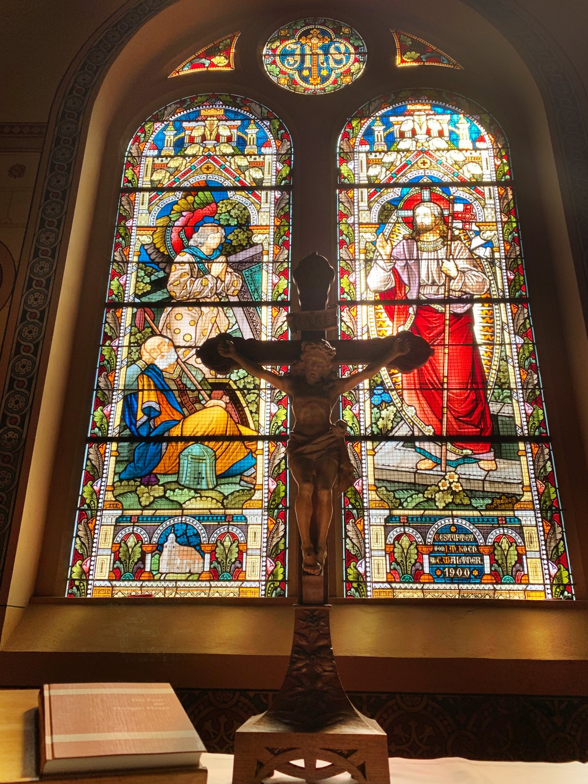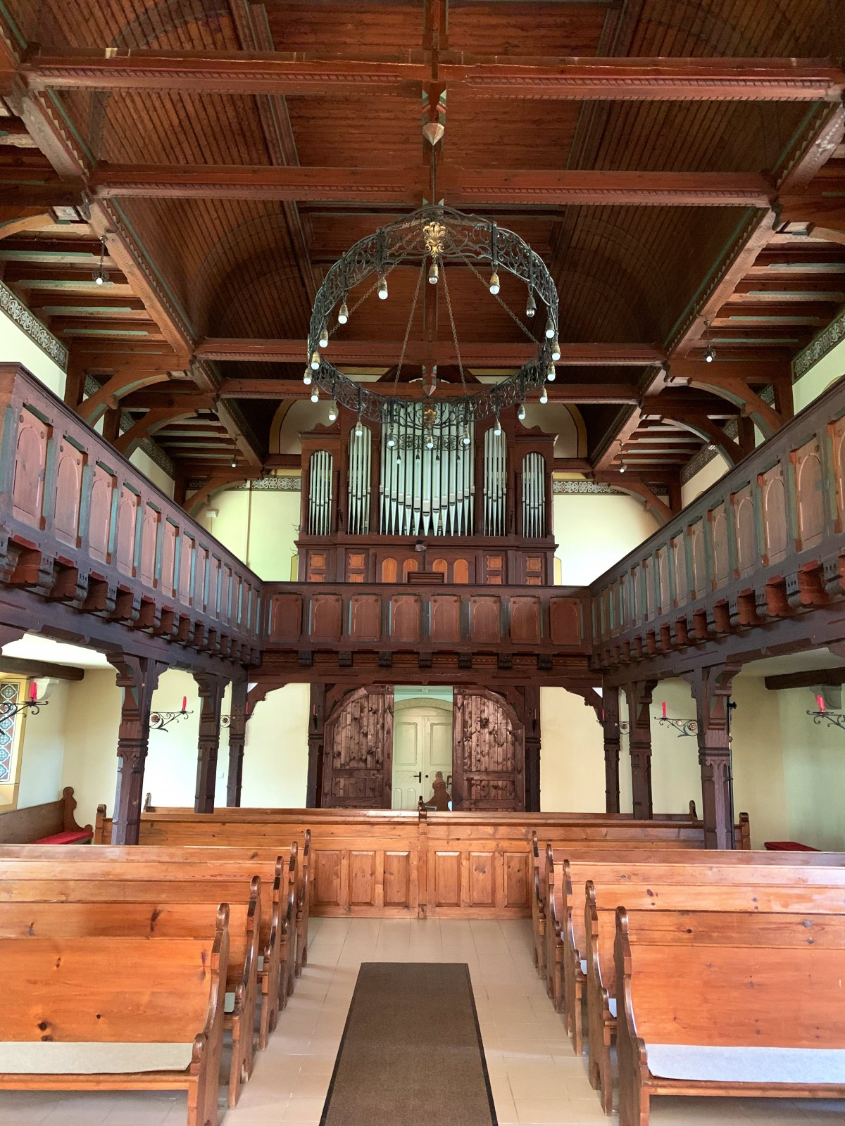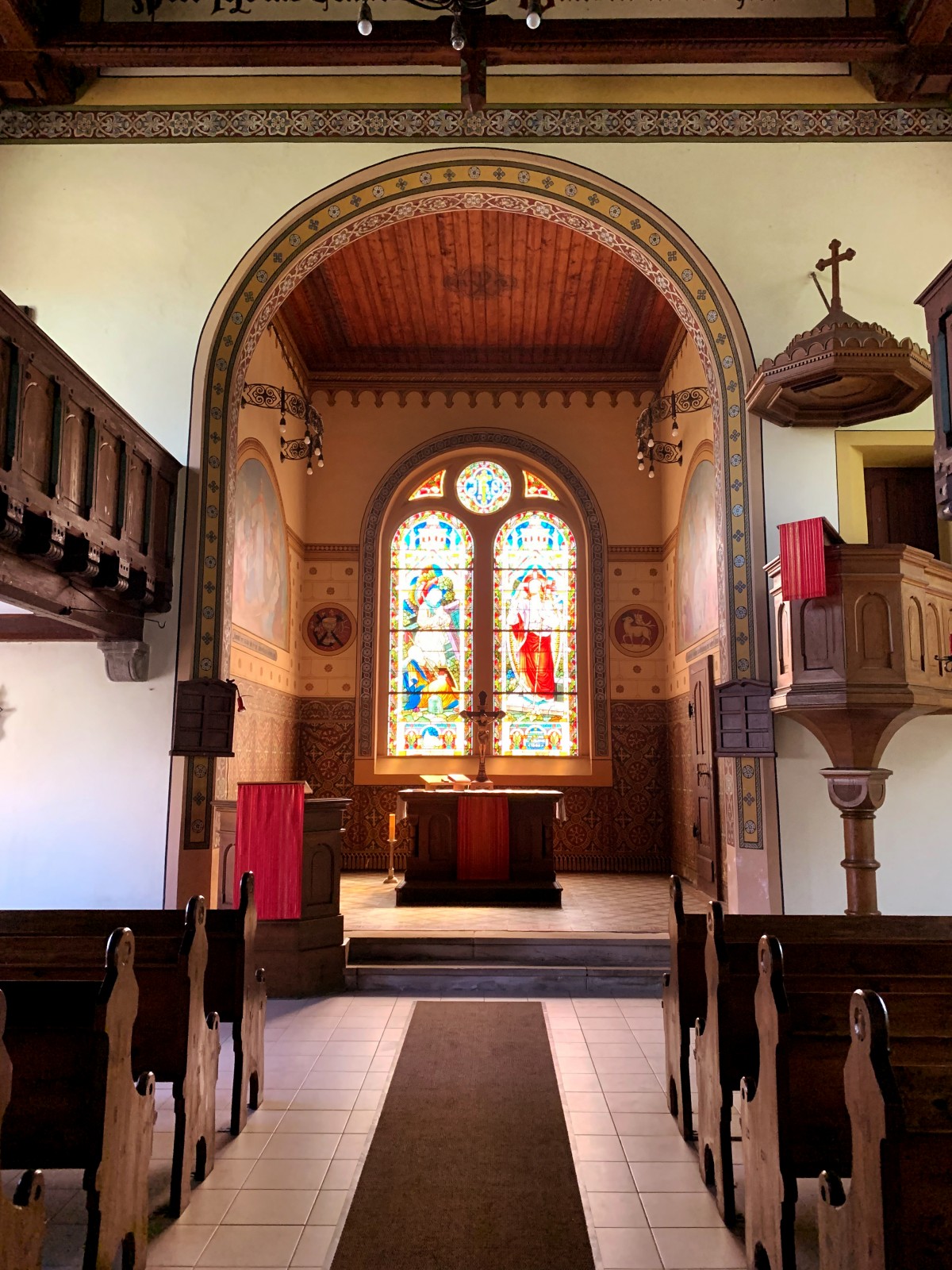 1901 wurde diese Kirche eingeweiht und hatte alles, was damals als technische Neuerung galt in sich vereint. Künstlerisch ist wohl das wundervolle Altarfenster, welches die Auferstehung Christi zeigt zu erwähnen und unbedingt sehenswert. Die Kirche ist, was ja sonst eher selten ist, im Baustil und in der Inneneinrichtung ganz aus einem Guß, was ihr zweifellos einen besonderen Reiz verleiht.