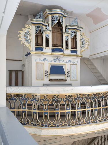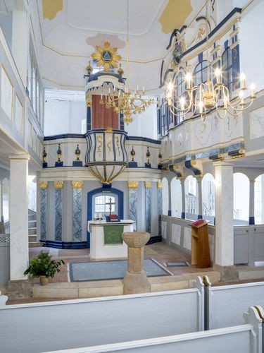 Unter der Herrschaft der Familie Diede zum Fürstenstein wagte sich die Gemeinde an einen spätbarocken Kirchenbau, dessen Kosten sie noch über Jahre beschäftigen sollte. Inschriftlich durch mehrere Chronogramme belegt, erfolgte die Fertigstellung der neuen Kirche im Jahr 1767. Ein lichter, großzügiger Raum bot nun der Gemeinde Platz. Über dem Kanzelaltar thront das Symbol der Dreifaltigkeit, auf die sich auch der Name der Kirche bezieht. Der Taufstein von 1680 stammt aus der Vorgängerkirche. Die Südseite prägt der prächtige Herrschaftsstand. Die Buchstaben FDZF bedeuten Freiherr Diede zum Fürstenstein.