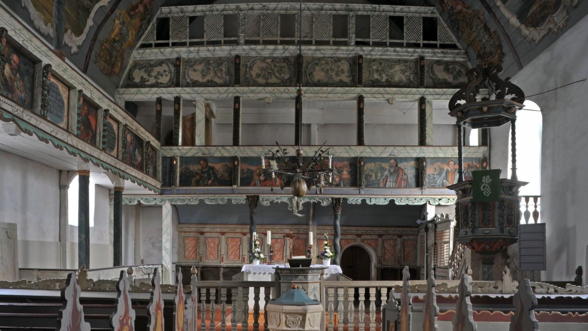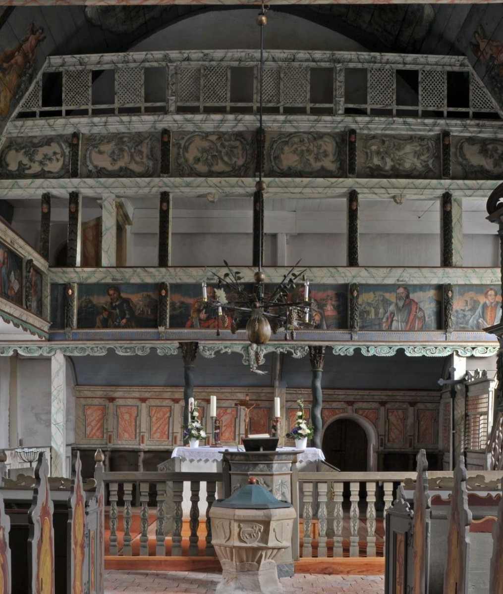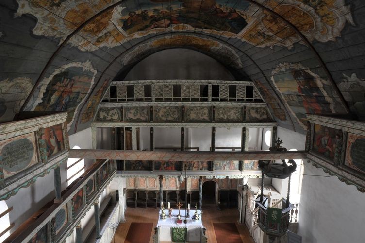 Erweiterungen des Baus fanden 1571 und 1671 statt. Die Vollendung der üppigen Ausstattung und Ausmalung im Stil des Spätbarock und des Rokoko fiel ins Jahr 1761. Die Emporen zeigen Evangelisten, Apostel und Propheten. Ein Bild der Auferstehung Christi ziert das Deckengewölbe. Begleitbilder stellen Johannes auf Patmos und Matthäus dar.
