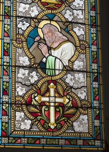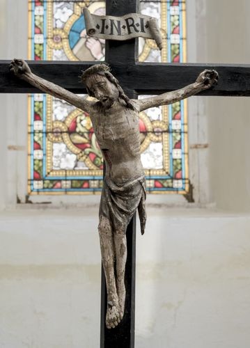 Im Mittelgang fällt ein Vortragekreuz am Emporen-Pfeiler auf. Bei Beerdigungen, Konfirmationen und Pfarrereinführungen trägt man es voran, als Zeichen dafür, dass Jesus vorausgeht. Der Weg zur Kirche führt in Mosbach über den Friedhof. Die Nähe der Gräber zur Kirche zeugt vom Glauben an die Auferstehung, dem Kern der christlichen Religion.