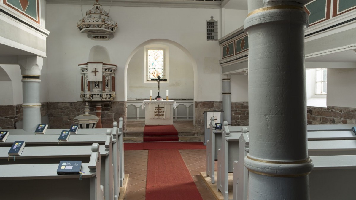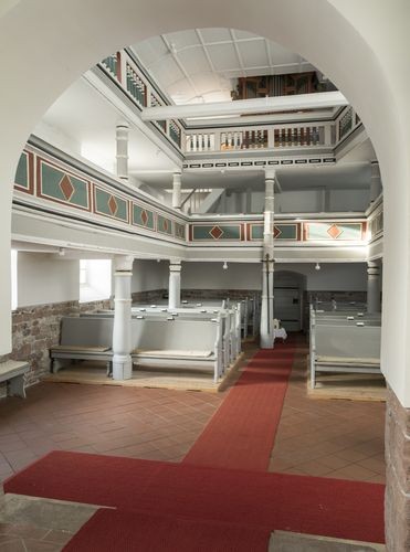 Die mittelalterliche Kirche nahm im 30-jährigen Krieg großen Schaden, so dass man das Langhaus neu errichtete. Das Untergeschoss des Turmes verweist auf das Mittelalter. Die Kanzel entstand laut Inschrift im Schalldeckel 1669. Aus dieser Zeit stammt auch das hölzerne Taufgestell. Im Jahr 1759 erhielt die Kirche eine Orgel von Sebastian Seitz, einem Schüler des berühmten Orgelbauers Gottfried Silbermann.