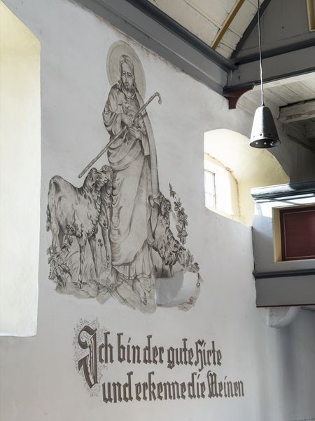 Mit der Renovierung von 1949 entstand ein Wandgemälde, das Christus als „Guten Hirten“ zeigt und die Bibel zitiert. Die Zeilen stammen aus einem Gleichnis, das Christus erzählt und das uns der Evangelist Johannes überliefert. (Joh. 10, 14) Er beschreibt Schafe, die ihren Hirten kennen und vertrauen.