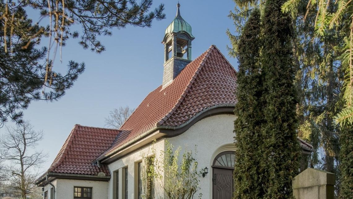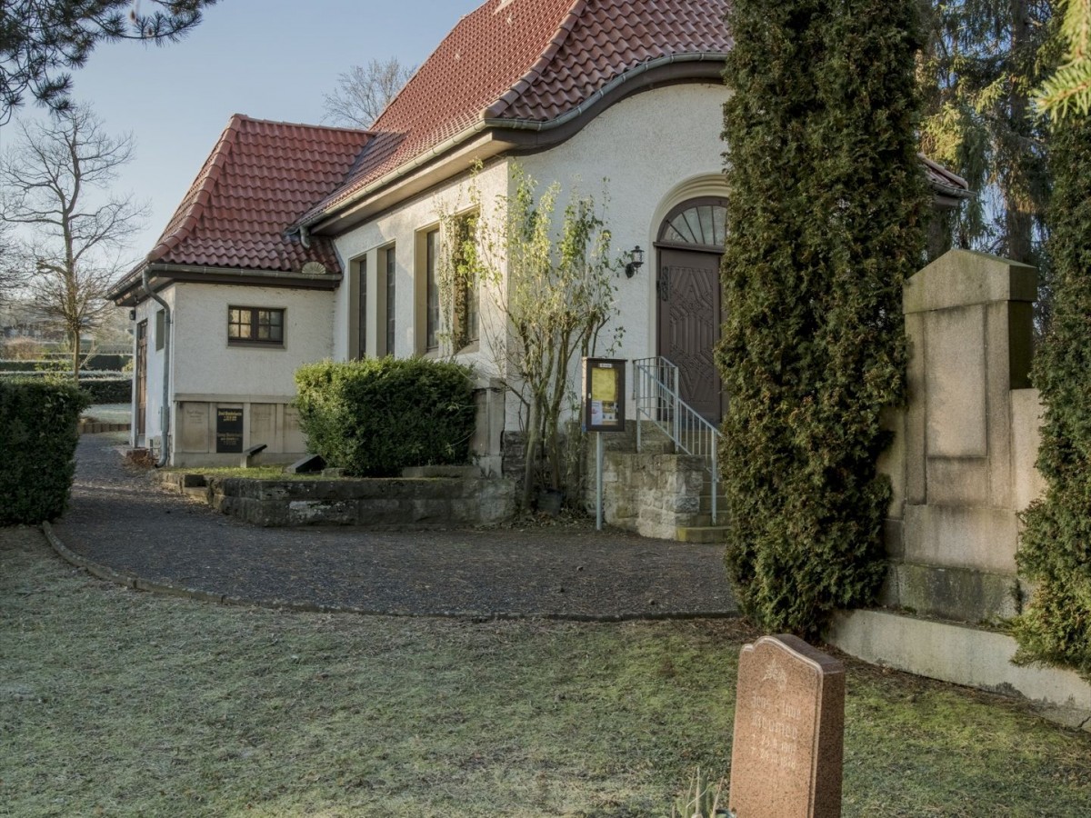 Damit kam der Wunsch nach einem eigenen Friedhof auf. Ein bäuerlicher Acker stand als Friedhofsland zur Verfügung, gestiftet von Familie Duphorn, die 1907 ihre Zwillinge verloren hatte und in Farnroda bestatten musste. Die wohl erste Beerdigung 1912 beging die Gemeinde, als sie den Besitzer des PETKUS-Werkes, Carl Friedrich Röber, zu Grabe trug, begleitet vom Läuten der schon im Bau befindlichen Friedhofskapelle. Die Fabrikanten-Familie hatte mit einer großzügigen Spende die Errichtung der Kapelle unterstützt. 1913 erfolgte die Weihe. Entstanden war ein wohlproportionierter Bau in Nord-Süd-Ausrichtung mit einem kleinen Anbau im Osten, der ursprünglich als Aufbahrungsraum diente. Der Rundbogen prägt den Eingangsbereich und den Innenraum des Sakralgebäudes. Das Innere wird durch längsrechteckige Fenster mit Bleiverglasung in mildes Licht getaucht. Ein Holzgewölbe überspannt den Saal, in dem die Gemeinde Platz nehmen kann. Ursprünglich zierten zahlreiche Sterne die gewölbte Decke. Bänke und Stühle sind grün gestrichen und geben dem ganz in weiß gehaltenen Raum einen frischen Ausdruck. Die Ausstattungsstücke waren ebenfalls Spenden, die zum Teil von der Familie Röber kamen, wie die Abendmahlsgeräte, die noch heute Verwendung finden.