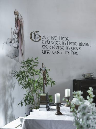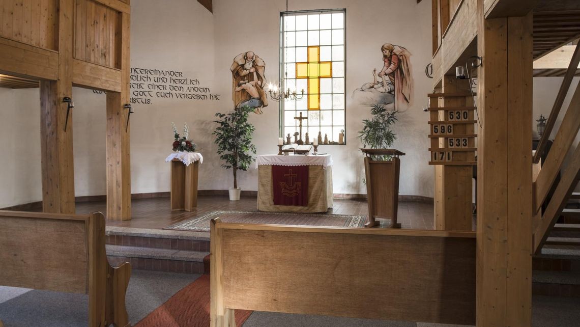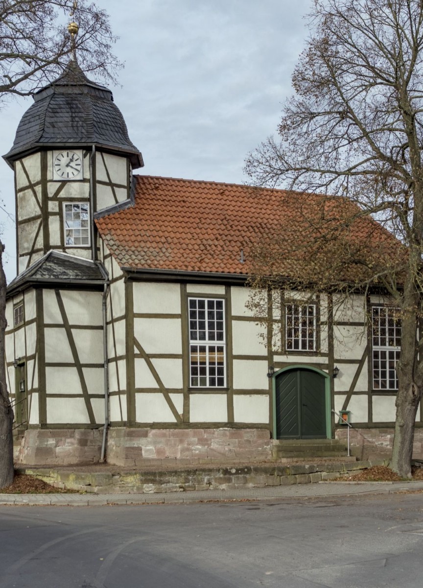 Die kleine Fachwerkkirche entstand im 18. Jahrhundert. An der Chorwand illustrieren moderne Bilder Bibelverse. Die nördliche Wandfläche zeigt einen alten Mann, der sich zu einem jungen, schutzbedürftigen Mann niederbeugt. Es ist eine Szene aus dem Gleichnis vom verlorenen Sohn.