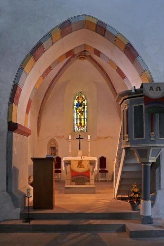 Die Chorturmkirche enthält vorreformatorische Bauteile. Der achteckige Turmaufsatz entstand im Jahr 1826. Das Langhaus vereint Bauphasen des 16. bis 18. Jahrhunderts. Zwei mittelalterliche Glocken gingen in den Kriegen verloren. Nach dem 2. Weltkrieg erwarb die Gemeinde neue Glocken. Das Läuten wird bis heute per Hand gesteuert. Eine Tafel mit Porträtfotos der Teilnehmer und Gefallenen des 1. Weltkrieges erschüttert den Betrachter angesichts der vielen Männer, die dem kleinen Dorf verloren gingen.