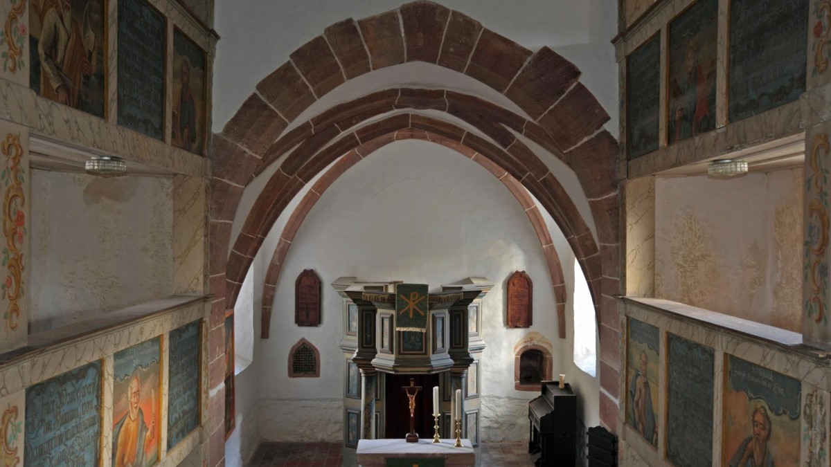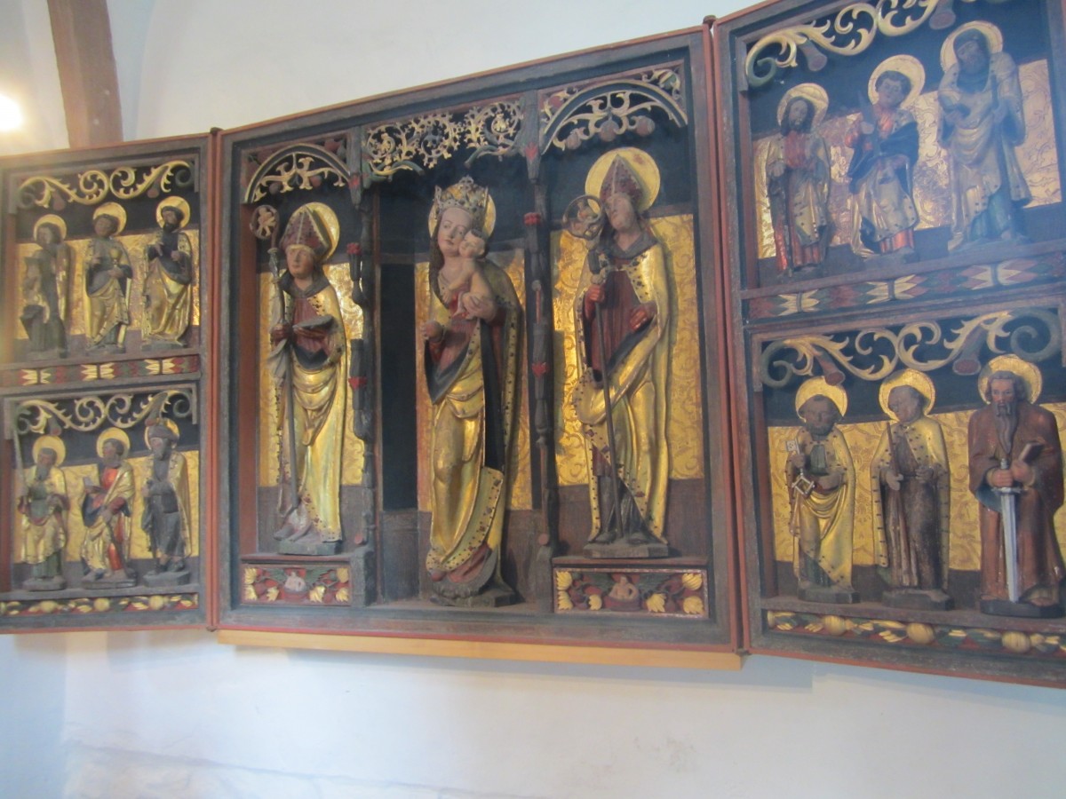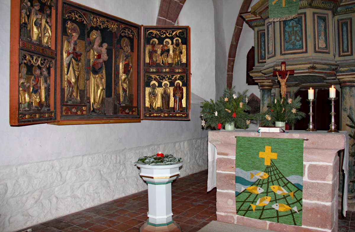 Die Emporen sind mit einem Bildnis König Davids und den Halbbildnissen der Apostel bemalt. Apostel zeigt auch der spätgotische Flügelaltar im Chor. Neben der Madonna im Mittelfeld stehen zwei Bischöfe, von denen der eine Fisch auf einen Teller trägt. Es könnte sich um den Heiligen Ulrich handeln. Das Attribut des anderen Bischoffs ging verloren. In den Flügeln stehen in zwei Etagen die Apostel. Die Skulptur des Heiligen Paulus ist eine spätere Ergänzung. Bis ins 20. Jahrhundert hingt der Altar in großer Höhe über dem Triumphbogen, die oberen Ecken waren abgesägt.
