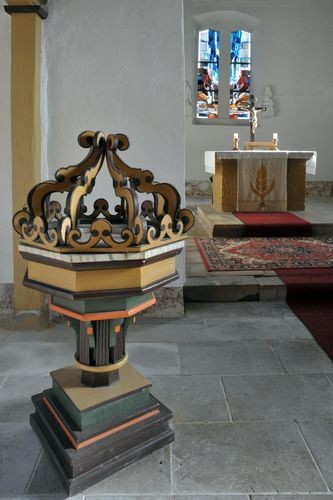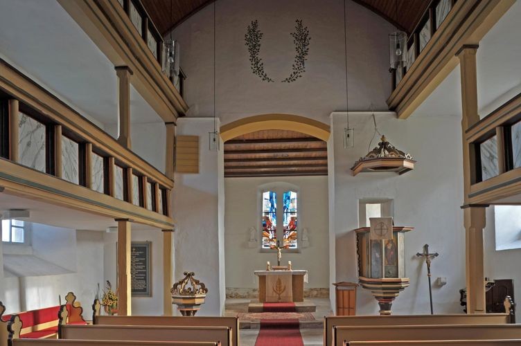 Die Kirche entstand 1614 anstelle eines Vorgängerbaus. Die Kanzel stammt aus der Erbauungszeit, die Ausstattung mit Emporen erfolgte im Jahr 1879. Das moderne Chorfenster greift die Wassersymbolik auf. Die reinigende und lebensspendende Kraft des Wassers spielt im Sakrament der Taufe eine zentrale Rolle.