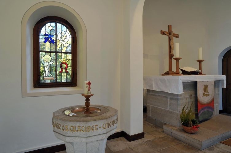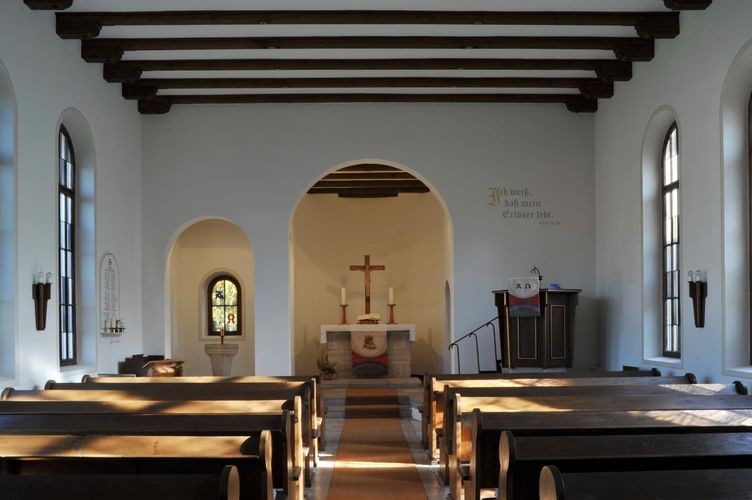Von Weitem grüßt die Kirche seitdem die Besucher hoch oben vom Weinberg, und dort angekommen, bietet sich ein traumhafter Blick über Ort und Landschaft. Die Kirche ist schlicht gehalten, wobei sie dank einer geschmackvollen Ausstattung im Innenraum aus einheitlichem dunklem Holz trotzdem wie ein Schmuckstück wirkt. Kanzel, Altar und Taufstein bestimmen das Bild, das Kruzifix des Empfertshäuser Holzschnitzers Harald Schrön zeigt Jesus mit erhobenem statt schmerzvoll gesenktem Kopf. Über der Eingangstür und seit Kurzem auch im Innenraum findet sich der Spruch »Ich weiß, dass mein Erlöser lebt«. Außerdem gibt es ein buntes Fenster in der kleinen Taufkapelle neben dem Altarraum und eine Lutherrose unter der Orgelempore – Martin Luther hätte diese Schlichtheit sicher begeistert. »Uns gefällt die einfache Ausstattung, alles Wichtige ist ja da«, sagt Karl Pfeiffer. Gemeinsam mit Karin Niebergall und Elke Wagner aus dem Kirchengemeinderat erzählt er stolz, wie auch alle Sanierungsarbeiten immer mithilfe der Einwohner des Ortes unterstützt wurden. So hat ein Nachfahre der Familie Wolfram die Neueindeckung des Dachs finanziert, dank vieler Helfer gab es innen und außen ein neues Kleid für die Kirche, Karl Pfeiffer hat sich um eine neue Heizung gekümmert. »Und wir sind dankbar für alle, die Kirchgeld zahlen, denn sonst könnten wir die Kirche nicht erhalten«, betont Elke Wagner.