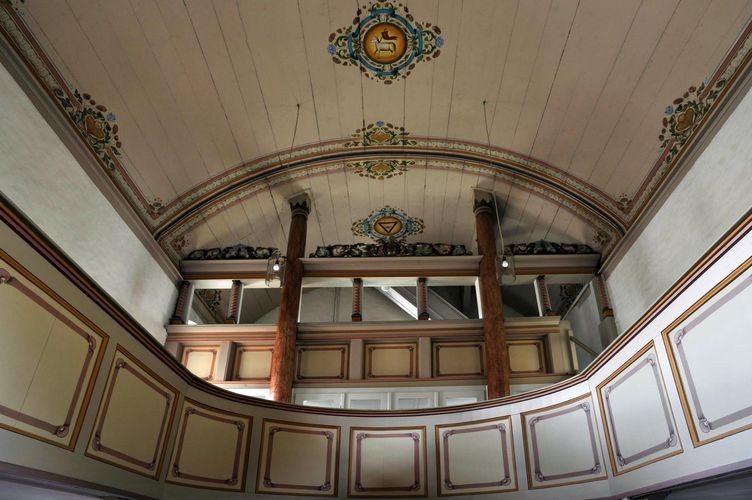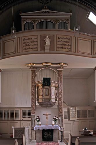 Den Raumeindruck bestimmt der hohe Kanzelaltar, über dem sich die Orgel erhebt. Der Kanzelzugang erscheint wie ein Portal, denn die Worte der Bibel öffnen den Weg zu Gott.