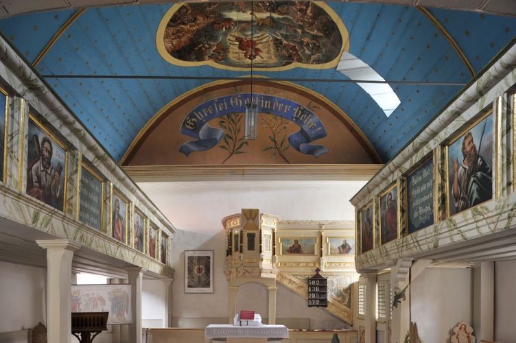 Die mit großem Einsatz der Gemeinde sanierte Kirche vereint Bilderwelten verschiedener Epochen miteinander und verbindet sie mit dem gegenwärtig gelebten Glauben. Machen wir uns heute andere Vorstellungen vom Glauben als die Bildschöpfer und Bildbetrachter vergangener Zeiten? Diese Frage stellt sich beim Erkunden des „Jüngsten Gerichts“. Erlöste kommen in den Himmel, Verstoßene in die Hölle. Welche Bilder des Weltenendes entwerfen wir heute? Wie bewerten wir verlorenes und gelungenes Leben? Vermitteln die Bilder heute noch Glaubensinhalte oder betrachten wir sie als rein kunsthistorisches Erbe?