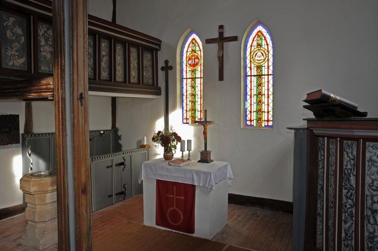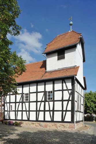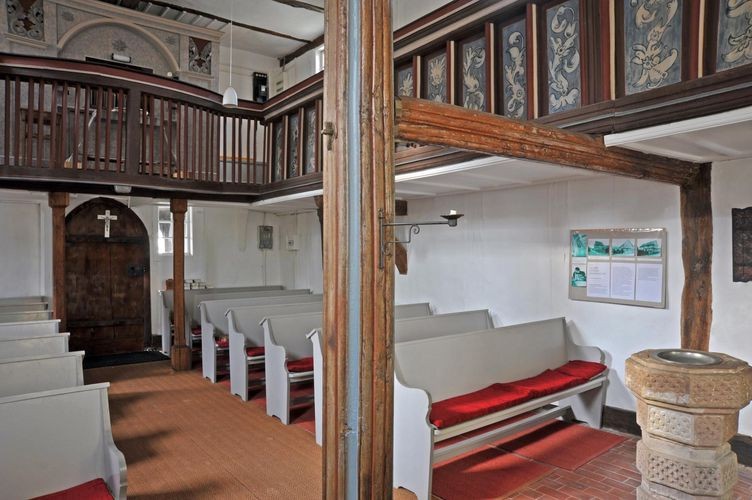 Die kleine Kirche ist ein in Thüringen seltener sakraler Fachwerkbau aus dem 16. Jahrhundert. Hinweise auf das Baujahr geben zwei Sachquellen: Eine alte Wetterfahne mit der Jahreszahl 1586 und der Taufstein, der die Jahreszahl 1587 trägt. Der stützende Mittelpfeiler und die Emporen sind spätere Einbauten aus der Zeit um 1600. Das Kruzifix an der Ostwand datiert ins 17. Jahrhundert. Das Altarkruzifix stammt aus Oberammergau und ist eine Stiftung aus dem Jahr 1835. Blattwerkornamente schmücken die Emporen. Dabei ist jedes Brüstungsfeld anders gestaltet. 1820 erhielt die Kirche eine Knauf-Orgel.