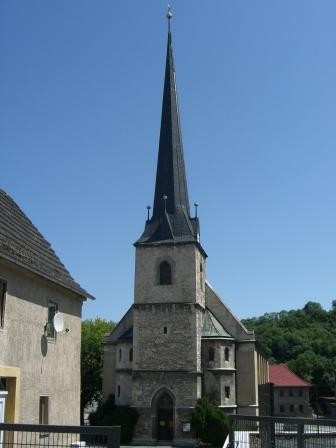 Die große einschiffige Kirche mit Westturm hieß ehemals Laurentiuskirche. 1219 wurde sie als Marktkirche dem Zisterzienserkloster in Eisenberg unterstellt. Der Turm und vermutlich auch das Kirchenschiff wurde um 1520 neu erbaut. Nach einem Brand wurde die Kirche 1703-08 unter Verzicht auf den gotischen Chor in Barockformen wiederhergestellt und in Trinitatiskirche umbenannt. 1897-99 fand eine umfangreiche Regotisiserung statt. Im Turm sind im Erdgeschoß das Kreuzrippengewölbe und in den oberen Geschossen die spätgotischen Fenster und Schallöffnungen von 1520 erhalten geblieben.