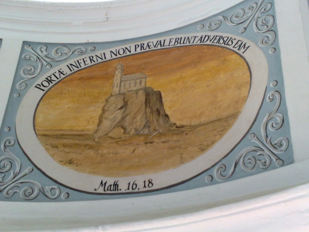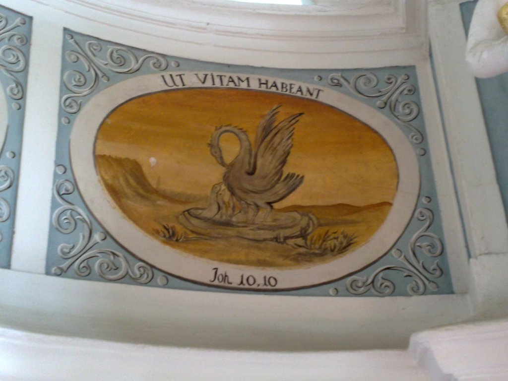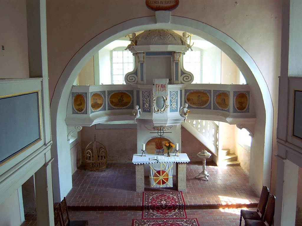Der Kanzelaltar hat auf Höhe der Kanzel nach vorne schwingenden Seiten. Auf der Brüstung und unterhalb der Kanzel finden sich sieben biblische Darstellungen. Am Kanzelkorb und auf dem Schalldeckel sind vier Engel angebracht mit den Symbolen Kelch und Brot sowie Anker und Kreuz.