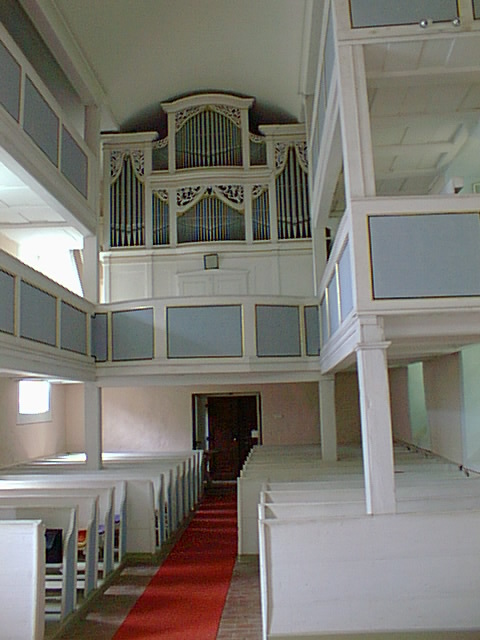 Aus der gleichen Zeit stammt die Innenausstattung der Kirche. Die Holzdecke ist in drei Bahnen segmentbogig gewölbt. Die dreiseitige Emporen sind an der Längsseite zweigeschossig. Auf der Westempore steht die Orgel aus dem Jahre 1830.