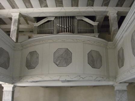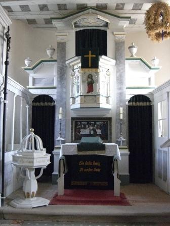 Im Chor befindet sich ein schlichter Kanzelaltar mit seitlichen Durchgängen. Der Kanzelkorb ist auf seinen fünf Feldern mit Christus Salvador und den vier Evangelisten bemalt.