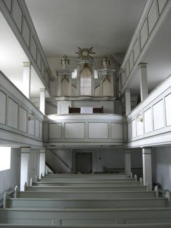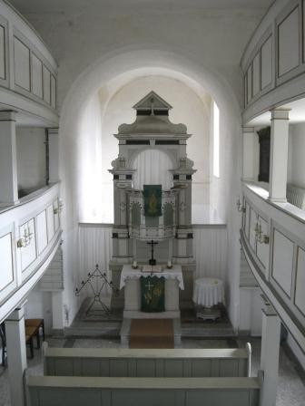 Entsprechend der Bauzeit ist der Innenraum durch schlichte barocke Formen geprägt. Dazu gehören zwei dreiseitige Emporen und der Kanzelaltar. Um 1910 wurde offenbar der Kanzelaltar aus dem Chorraum im Turmerdgeschoß in Richtung Kirchenschiff versetzt. Diese Veränderung beeinflußte den Raumeindruck kaum.