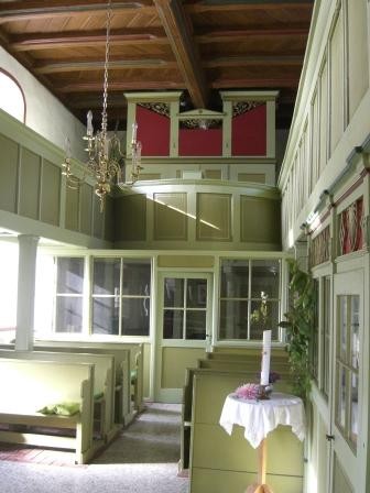 In die Zeit des Umbaus bzw. des Barocks ist ein Großteil der Inneneinrichtung zu datieren. Dazu gehören der Kanzelaltar und die dreiseitige Empore mit dem Orgelprospekt. Die beidseitigen Herrschaftsstände wurden im 19. Jahrhundert eingebaut. Die flache Holzdecke besticht durch seine profilierten Balken und den Deckenbrettern im Fischgrätenmuster.