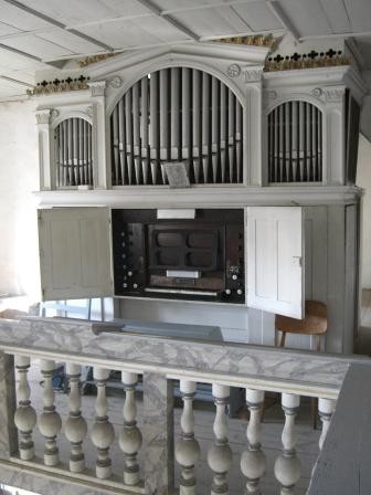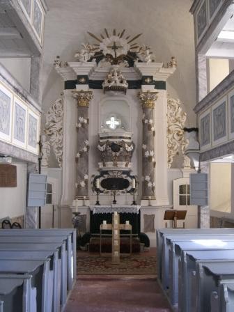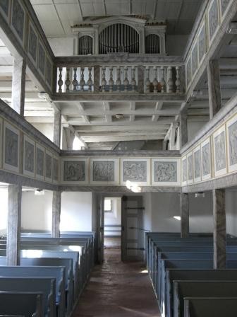 Am Kanzelaltar mit seinen Rebensäulen sind über den seitlichen Pforten Petrus und der Evangelist Johannes zu erkennen. In dieser Zeit wurden die dreiseitigen und zweigeschossigen Emporen mit der Orgel sowie die Felderdecke eingebaut. An der Ostwand des Altarraums sind Fragmente der figürlichen spätgotischen Ausmalung zu sehen.