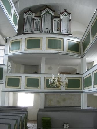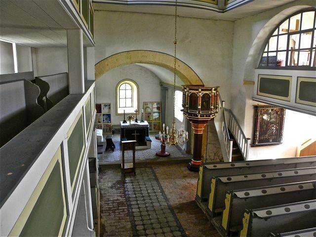 Die einschiffige Chorturmkirche wurde 1608 um ein südliches Seitenschiff erweitert und ist vom Hauptschiff durch eine Doppelarkade getrennt. Im Hauptschiff befindet sich zwei Emporen, die zweite ist umlaufend. Im Obergeschoss des Seitenschiffes wurde im ehemaligen Patronatssitz eine Winterkirche eingerichtet. Dort hängt auch ein Kruzifix aus dem 16. Jahrhundert.