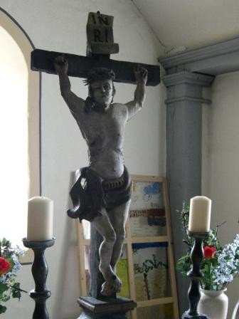 Das Tonnengewölbe im niedrigen Chorraum wurde möglicherweise 1553 eingebaut. Auf dem steinernen Altar steht ein volkstümliches Kruzifix. An der Südseite des Chorbogens steht die Kanzel mit den Gemälden des Christus Salvator und der Evangelisten aus dem 17. Jahrhundert.