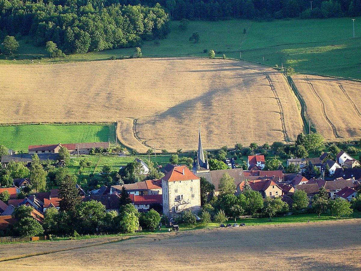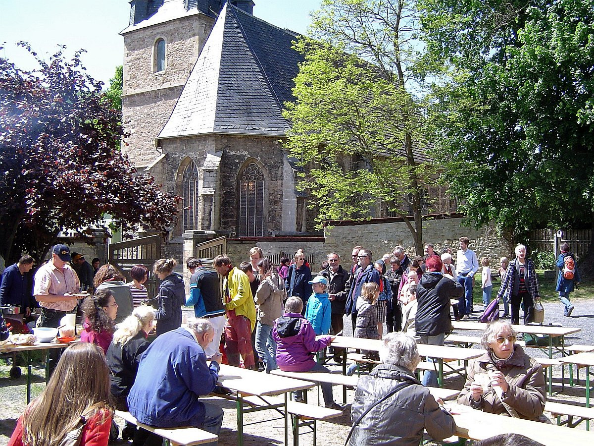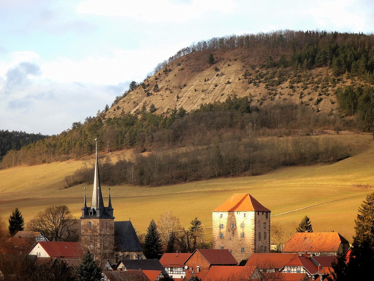 Die Kirche wurde 1473 eingeweiht und ist eine der interessantesten Wehrkirchen in Thüringen. Im Mittelalter war sie ein Teil der Befestigungsanlage, zu der die Kemenate, das Pfarrhaus und das Forsthaus sowie eine Wehrmauer gehörten. Im Dachgeschoss der Kirche ist noch der Wehrgang erhalten. Die Außenmauern und der Turm haben zahlreiche Schießscharten und Gießerker.