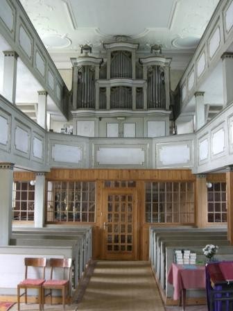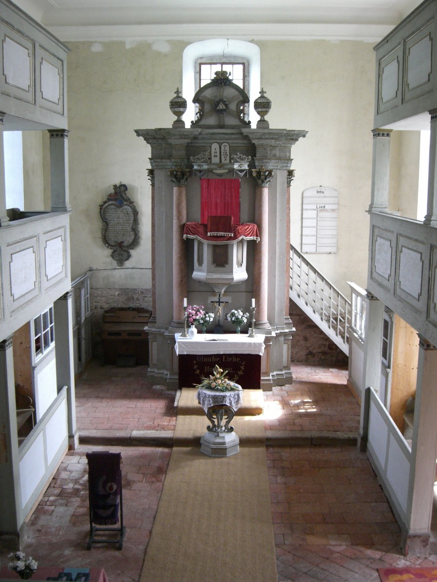 1787 wurde die Saalkirche mit östlichen Dachturm im klassizistischen Stil an der Stelle einer Vorgängerkirche erbaut. Der Innenraum zeigt in den barocken Grundformen ebenfalls den frühklassizistischen Charakter. Der Kanzelaltar im Osten und die Orgel im Westen, von von Carl Friedrich Poppe d.Ä. aus Roda 1798-1800 erbaut, dominieren den Raum. An der Stuckdecke erinnert das sächsiche Wappen an die Zugehörigkeit zum Herzogtum Sachsen-Gotha-Altenburg.