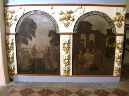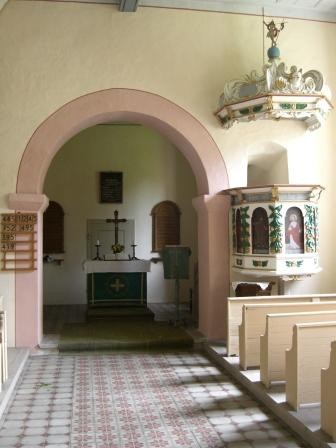 Zum romantischen Eindruck der Kirche trägt die mit kreuzförmigen Eisenbeschlägen versehene Eingangstür der Kirche bei. Es ist eine Arbeit des 16. Jahrhunderts. Im Innern ist der Chor durch einen Triumphbogen vom Kirchenschiff getrennt. Die barocke Kanzel mit reichverziertem Deckel stammt vermutlich von 1712. Im Chorraum befindet sich ein lutherischer Beichtstuhl aus dem frühen 18. Jahrhundert. An der Brüstung thematisieren die Gemälde Beichte und Vergebung der Sünden.