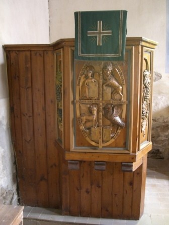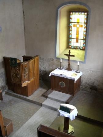 Der Altar, die Kanzel und das Buntglasfenster stammt aus der Zeit nach dem II. Weltkrieg. Das Altarkruzifix als auch die volkstümlichen Schnitzereien am Kanzelkorb mit den vier Evangelistensymbolen stammen vom Bildhauer Louis Krause von Stadtroda aus dem Jahre 1948. Auf der kleinen Westempore steht eine Harmonium für die Begleitung der Gemeinde bereit.
