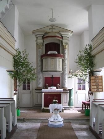 1835 wurde der Innenraum im klassizistischen Stil neugestaltet. Der Kanzelaltar symbolisiert die bis ins 19. Jahrhundert postulierte Gleichrangigkeit von Predigt und Abendmahl. Neben dem Kanzelaltar entstand auch die dreiseitige Empore. Die Orgel stammt bereits aus dem Jahr 1788 und wurde von Christian Friedrich Poppe d.Ä. aus Roda erbaut.