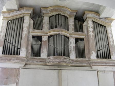 Innen gliedert die dreiseitige Empore und der Kanzelaltar den Raum. Der Kanzelaltar mit neugotischen Prospekt nimmt die gesamte Raumbreite ein. Über der Kanzel ist an der Decke ein ovaler Stuckrahmen mit Wolkenmalerei und plastischen Putto. Fünf Schnitzfiguren aus einem spätgotischen Altarretabel sind zur Zeit ausgelagert. Die Orgel wird in der Zeit 1780/90 entstanden sein.