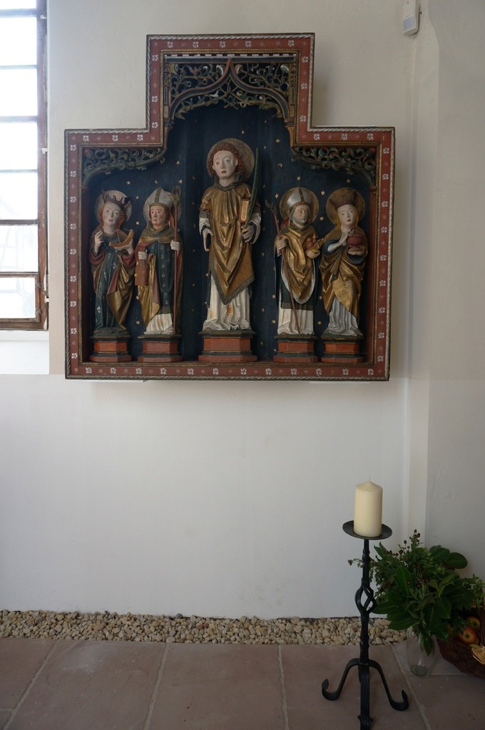 Kostbarstes Inventar sind die beiden gotischen Schnitzwerke: Altar und Kruzifix. In der Mitte des Altares ist Laurentius, zu seiner Linken ist Nikolaus und Katharina, zur Rechten ist Bonifacius und die Heilige Elisabeth von Thüringen zu sehen.