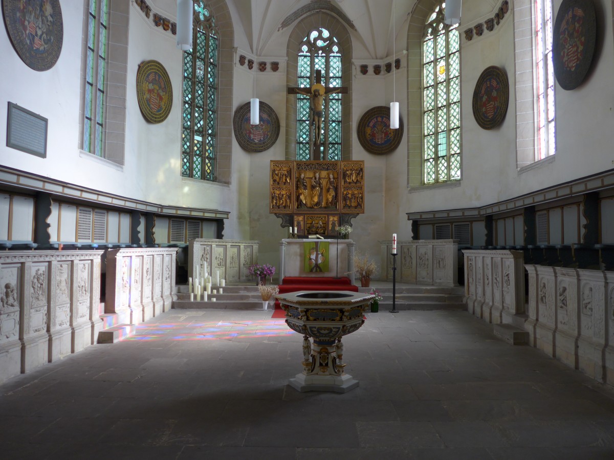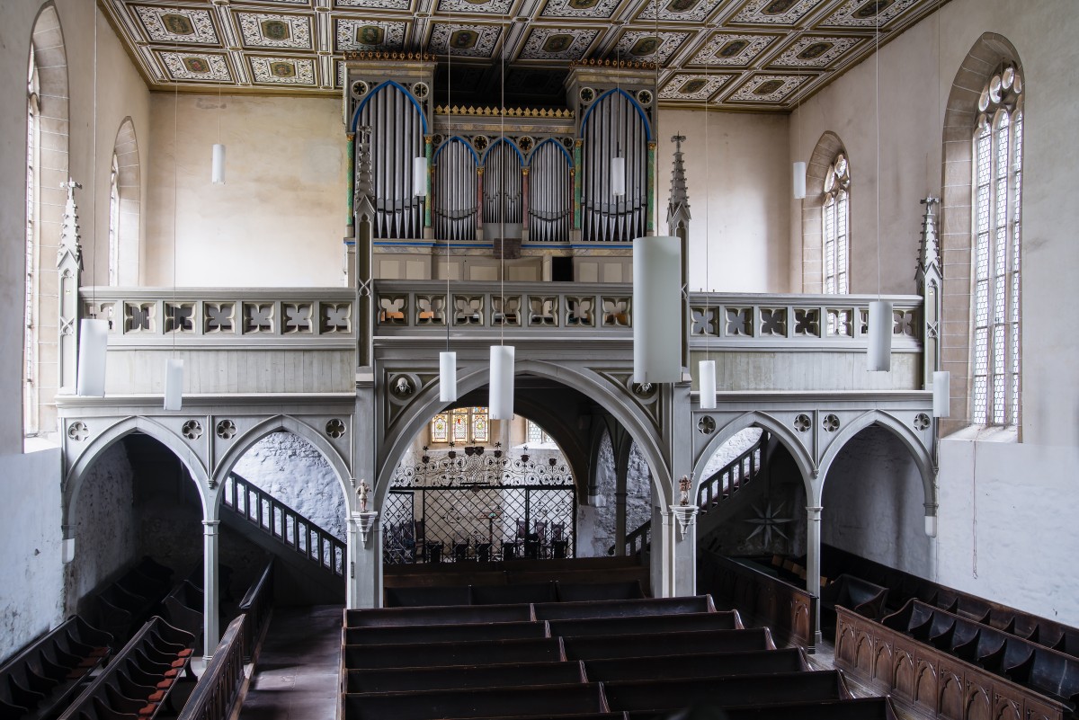 - Besonderheiten: Renaissance-Ausstattung, Taufe, Kanzel, Kassettendecke, Steinbilderbibel (eine Bildfolge zum Alten Testament)