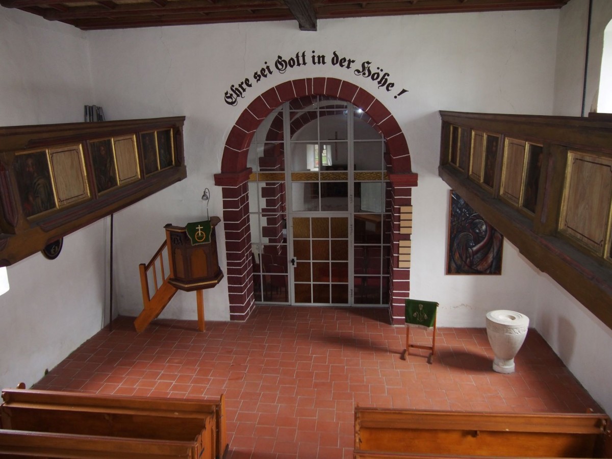 Barockes Kirchenschiff unter Verwendung älterer Mauern, Emporen mit prächtiger Ausmalung wohl Mitte des 19. Jahrhunderts, Poppe-Orgel von 1856, zwei noch mittelalterliche Bronzeglocken,
