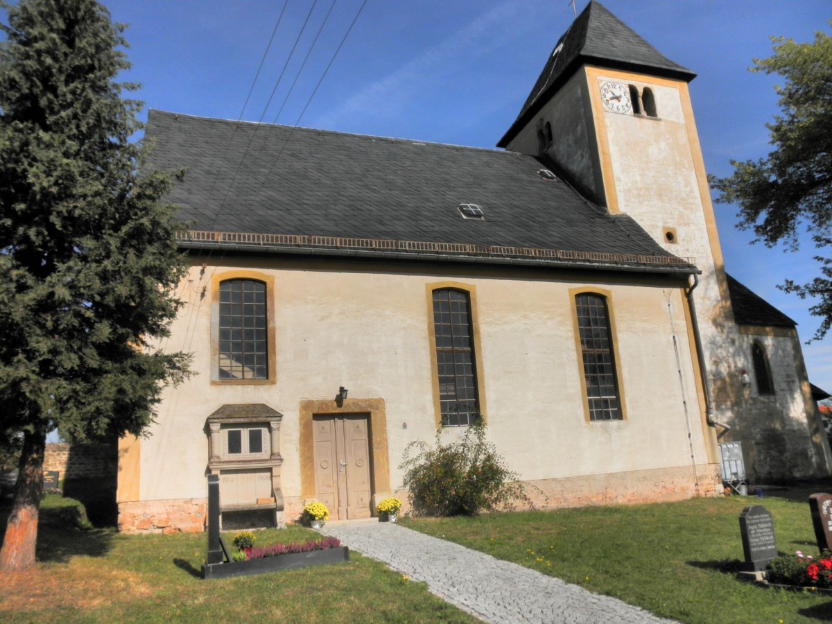 Wohl schon sehr früh bekam die Gemeinde eine Taufkapelle, weil der Weg nach Cronschwitz weit und beschwerlich war. Wir erkennen die Kapelle im heutigen Turm und Altarraum wieder. Sie wurde im romanischen Stil erbaut. Hierauf weisen der fensterlose Chorschluss (Apsis) mit Halbkuppel, die Korbbogenpfeiler mit Kämpfergesimsen, die rundbogigen Tragebogen, die gepaarten Rundbogenfenster im oberen Turmgeschoss auf Säulen mit Würfelkapitellen ruhend sowie eine ehemalige Luftöffnung, die auf der Nordseite der Kirche an der Außenwand zu sehen ist. Auch das Tabernakel, welches früher durch eine eiserne Gittertür verschließbar war, ist ein Hinweis auf den romanischen Baustil. Der Apsis besitzt ein Steindach, welches heute unter einem Schieferdach verborgen ist.