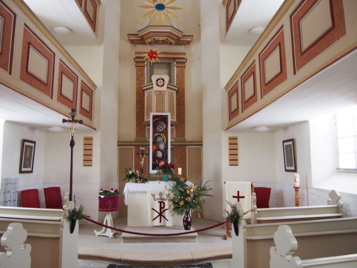 Die Querwand, welche die Sakristei vom Kirchenschiff trennt, war bis in die Mitte des 20. Jahrhunderts von Fenstern durchbrochen. Der Altar befindet sich direkt unter der Kanzel, ein sogenannter Kanzelaltar aus der Erbauungszeit. Ebenfalls aus dem 18. Jahrhundert stammt ein Taufengel, weiß mit Vergoldungen, der von der Decke herabhäng. Er trägt ein Spruchband und einen Ring für die Taufschale in den ausgestreckten Händen.