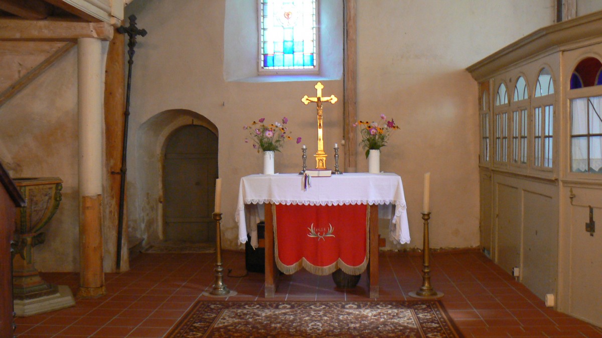 Im Kircheninnern wurde der Raum mit einer Holztonne überspannt, die der Bautätigkeit des 17. Jahrhunderts zuzuordnen ist. Die Kanzel ist eine Renaissancearbeit, ebenfalls aus dem 17. Jahrhundert, angebracht auf einem Pfeiler an der Südwand. An den Kanzelecken befinden sich kleine Säulen, unten und oben ist teilweise Schnitzwerk aufgelegt. Der Schalldeckel, der etwa von 1850 stammt, ist wie die Kanzel achteckige und hat eine hübsche Krone.