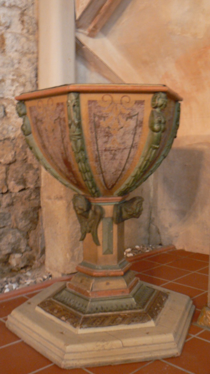 Außen an der Südmauer befindet sich ein Grabstein aus dem Jahre 1760, dessen Rückplatte als Schweifbogennische gefertigt wurde, deren Pilaster mit Blumengehängen besetzt sind. Auf den etwas vortretenden Sockeln befindet sich links ein Stundenglas, rechts ein Schädel.