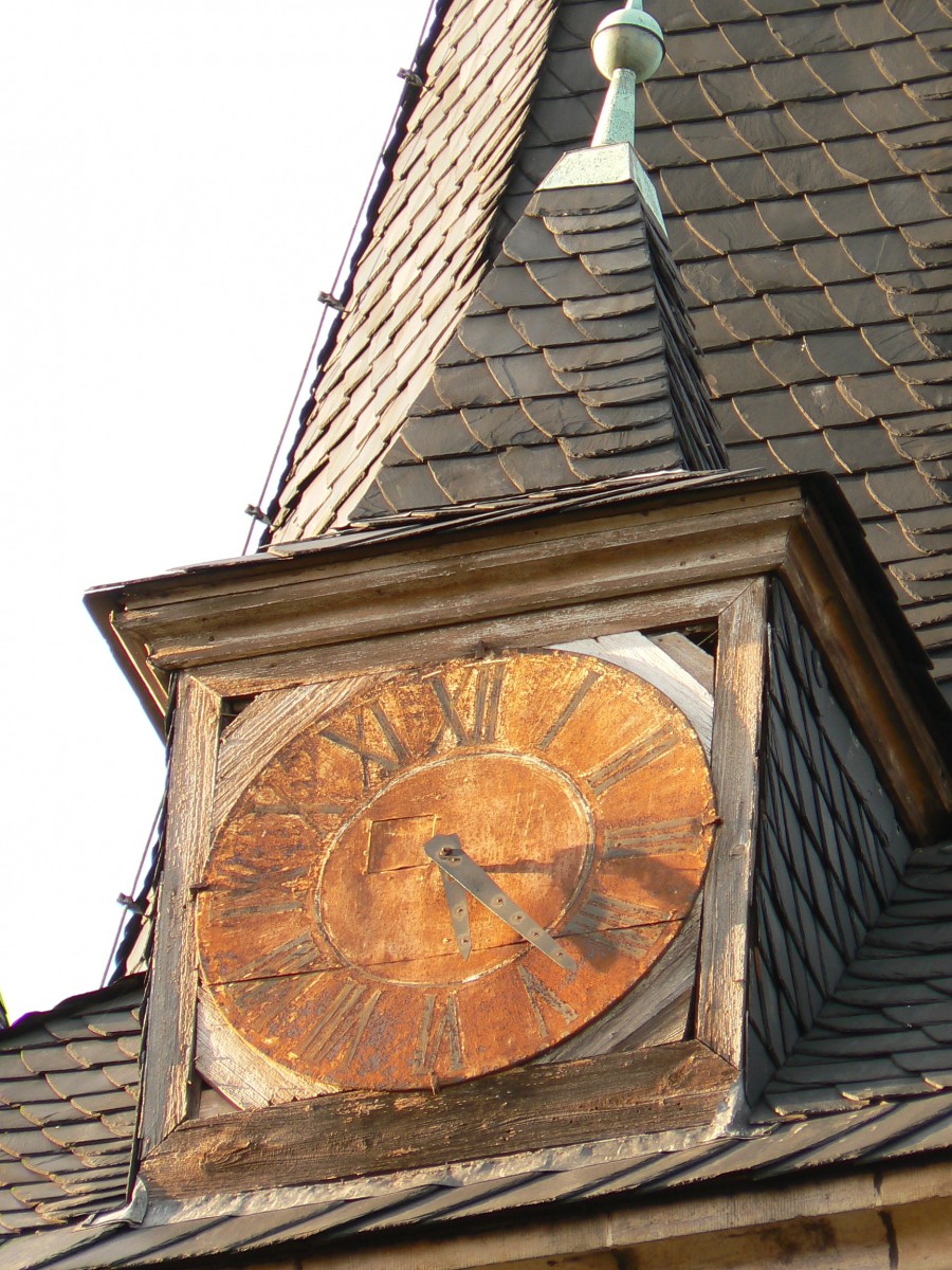 Die ganze Nordseite und auch die Westseite sind fensterlos. Der Turm, welcher an der Ostseite oben die Jahreszahl 1581 zeigt, hat auf der Südseite neben neueren Rechteckfenstern im Erdgeschoss und im zweiten Obergeschoss, im dritten Obergeschoss große Rundbogenfenster aus dem 18. Jahrhundert. Den Kirchturm ziert eine Uhr, die Tag für Tag die viertel, halben und ganzen Stunden schlägt.