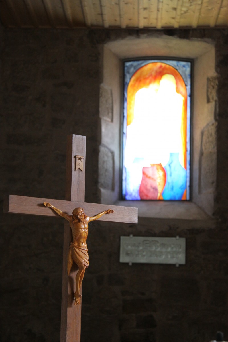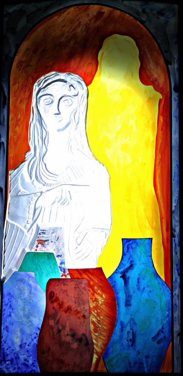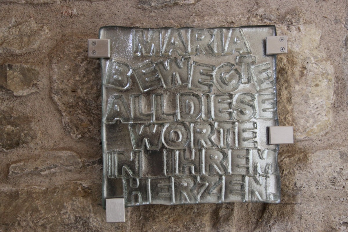 Verbunden mit der Namenswidmung 2017 war die Enthüllung des Marienfensters, das Pater Meinrad aus der Abtei Münsterschwarzach im fränkischen Schwarzach am Main geschaffen hat. Es zeigt Maria auf der Hochzeit zu Kana, die mit dem Zeigefinger auf ihren Sohn weist, der ebenfalls Gast der Gesellschaft ist. Ihr zu Füßen stehen jene Weinkrüge, deren Wasser Jesus zu Wein verwandelte. Pater Meinrad hat dafür und für den Hintergrund leuchtende Farben verwendet, die im Ostfenster im Sonnenaufgang besonders zu Geltung kommen. Die Figur Marias hingegen hielt er in Glasfarbe, durchscheinend und klar.