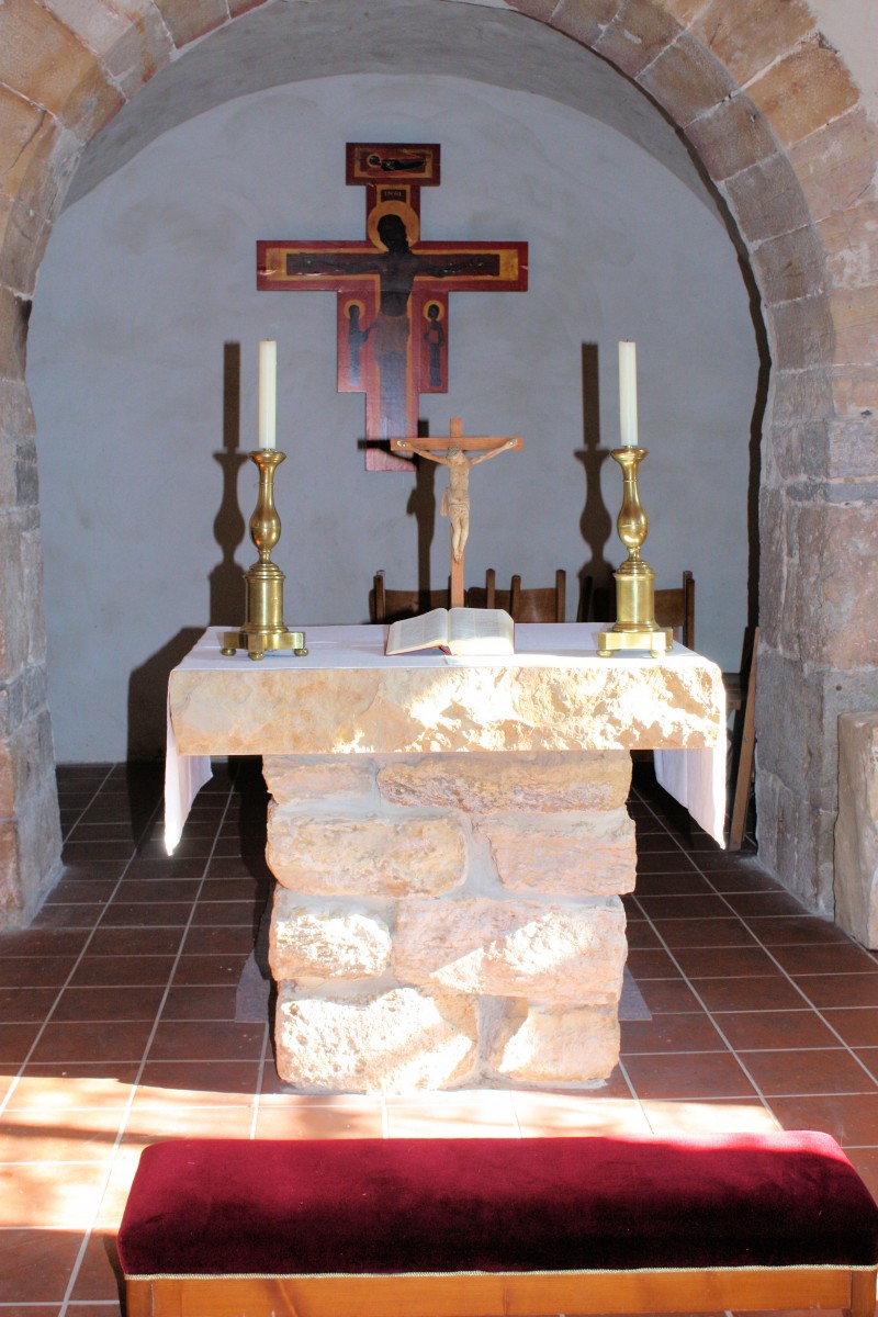 70 Stühle sind nicht in Reihen, sondern in einer gemeinschaftlichen U-Form gestellt. Bis zu 100 Leute haben in der Kirche Platz.