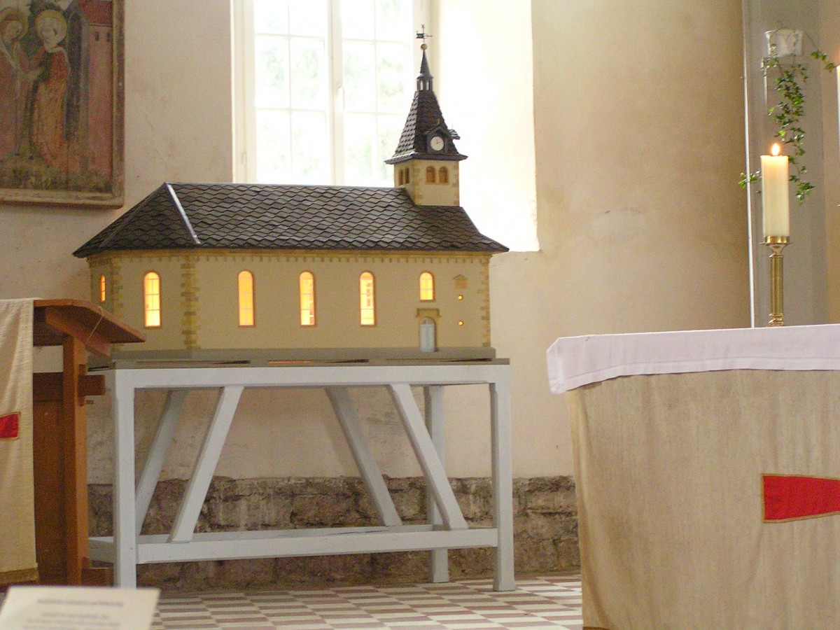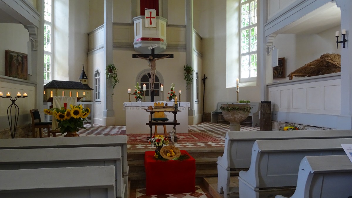 Die vier Ecken hat man wieder auf Waidmühlsteine gesetzt, die schon den Vorgängerbau trugen. Davon ist einer auf der Nordwestecke des Turmes sichtbar. Den alten Turm bezog man in die neue Kirche ein. Helles Licht strahlt durch die klassizistischen Rundbogenfenster in den schlichten und klar gegliederten Raum.