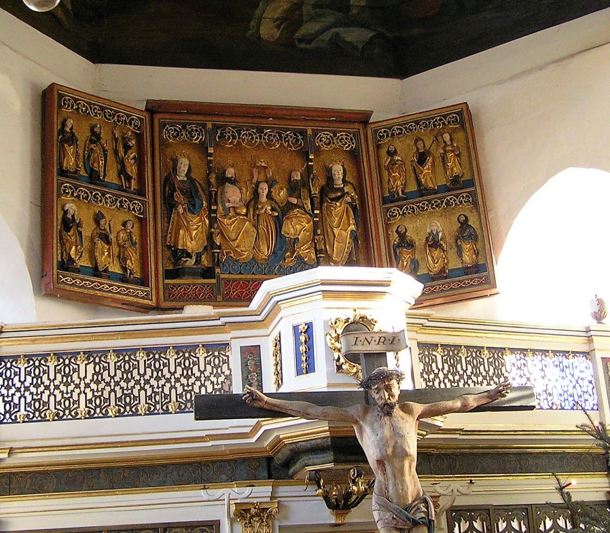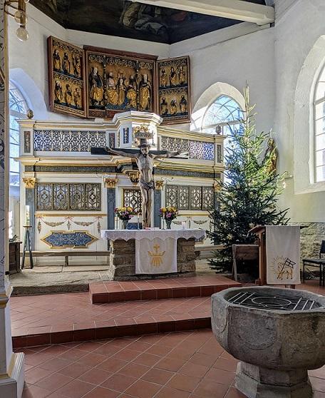 Die Kirche St. Wigbert ist eine der ältesten Kirchen im Landkreis Gotha. Turm und Schiff wurden zwischen 1483 und 1485 auf den Fundamenten einer Vorgängerkirche aus der Karolinger Zeit (9.- 10. Jhd.) als spätgotisches Bauwerk errichtet. Wesentliche Bauteile sind in typischer architektonischer Ausdrucksform bis heute überkommen. Auch historische Ausstattungsstücke blieben zum Glück er- halten. Im Barock (um 1744/45) erfolgte eine Umgestaltung an den Fenstern und an der Innenausstattung. Drei Emporen fanden ihren Platz an drei Gebäudeflanken (Süd/West/Nord). Auch eine angepasste Kanzelwand wurde dank der Initiative eines Stifterehepaares an ihren Platz im Chor auf der Ostseite eingebaut. Besonders beeindruckend wirken die Ornamentmalereien an den Emporen auf blauem Grund in gestalterischer Vielfalt, aber auch das durchgehende Deckenfries in gleicher Technik und das Deckenbild mit lebensgroßen Figuren am östlichen Abschluss der Deckentonne. Ein besonderes Ausstattungsstück ist der spätgotische Flügelaltar von 1518.
