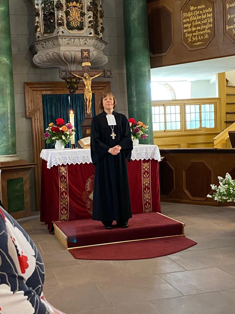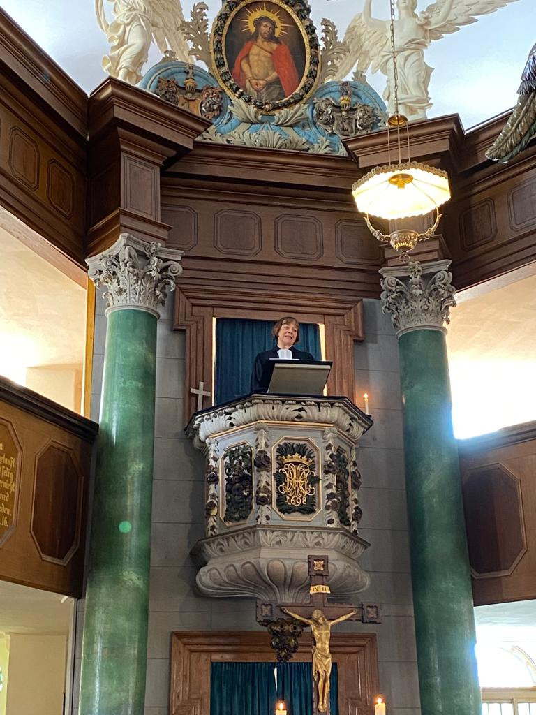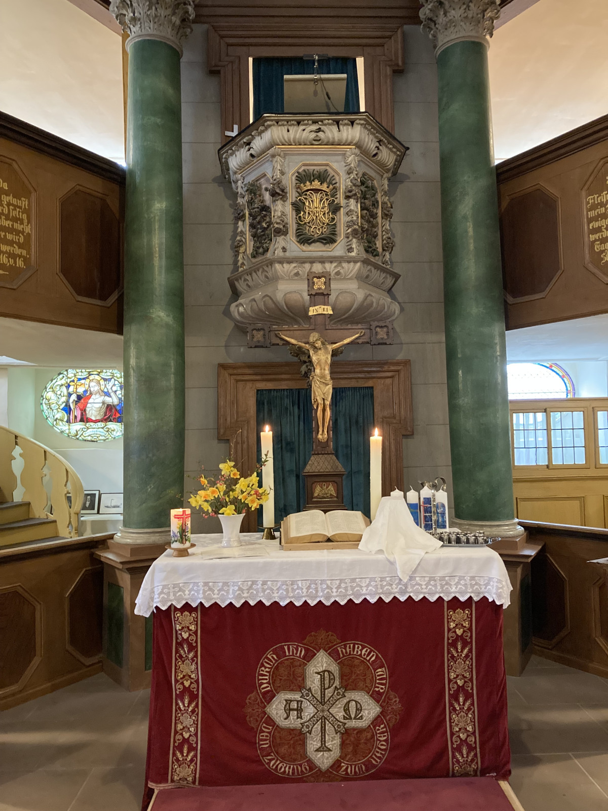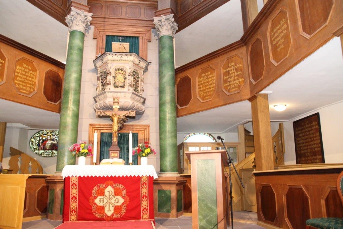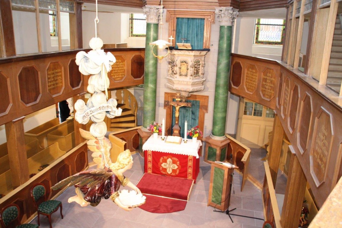 Im Inneren befindet sich eine doppelgeschossige Empore aus Holz auf rechteckigen Pfosten, östlich ein zwischen monumentalen korinthischen Säulen eingefügte Altar-Kanzel. Diese ist von einem hochoval gerahmten Ecce-Homo-Gemälde bekrönt und von Engeln flankiert. Der Kanzelkorb ist reich mit vegetabilischer Schnitzerei verziert (Datierung: 1698). Das Gestühl ist achteckig zentriert. Ein überregional beachteter Taufengel, der im Kirchenraum frei zu schweben scheint, verweist mittels Inschrift auf das Jahr 1700. In das Epitaph des Stifters der Kirche Herrmann Wissmann († 1717) ist in architektonischer Rahmung die weiße Marmorbüste des Verstorbenen integriert.